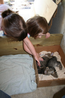 Brody needed a little help with learning how to treat the kittys. He was very nice and petted them very sofly, but then he took one out of the box by it's leg, yes, it's leg! I had my camera in hand and couldn't decide what to do, help the kitty, or take a picture I went back and fourth and ended up not doing either!